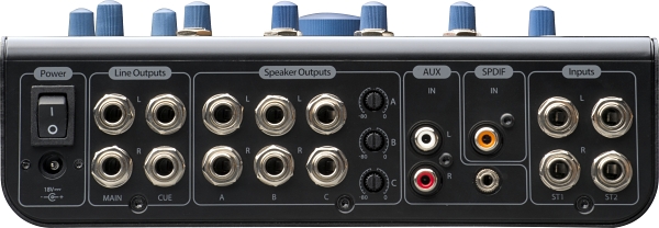 * 3 Stereo pairs of ¼-inch TRS speaker outputs with level controls, 1 Stereo pair of ¼-inch TRS Main outputs and 1 Stereo pair of ¼-inch TRS Cue outputs