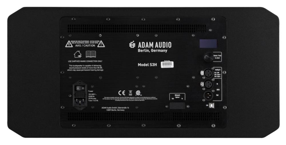 The S Series’ custom-designed DSP optimizes the loudspeaker crossovers to create linear responses for the entire range, as well as providing user equalization and in-room tuning/voicing functions. A unique feature of the S3H’s DSP options is a built-in factory EQ preset that emulates the response of ADAM Audio’s legendary S3A monitor. The DSP also handles the limiter-based high-frequency driver protection, processes the signals from the AES3 digital inputs, and will in time facilitate various expansion options. Software updates can be carried out with ease via the associated USB port, which also allows users to connect computers and control the speakers’ DSP functions via a software front-end.