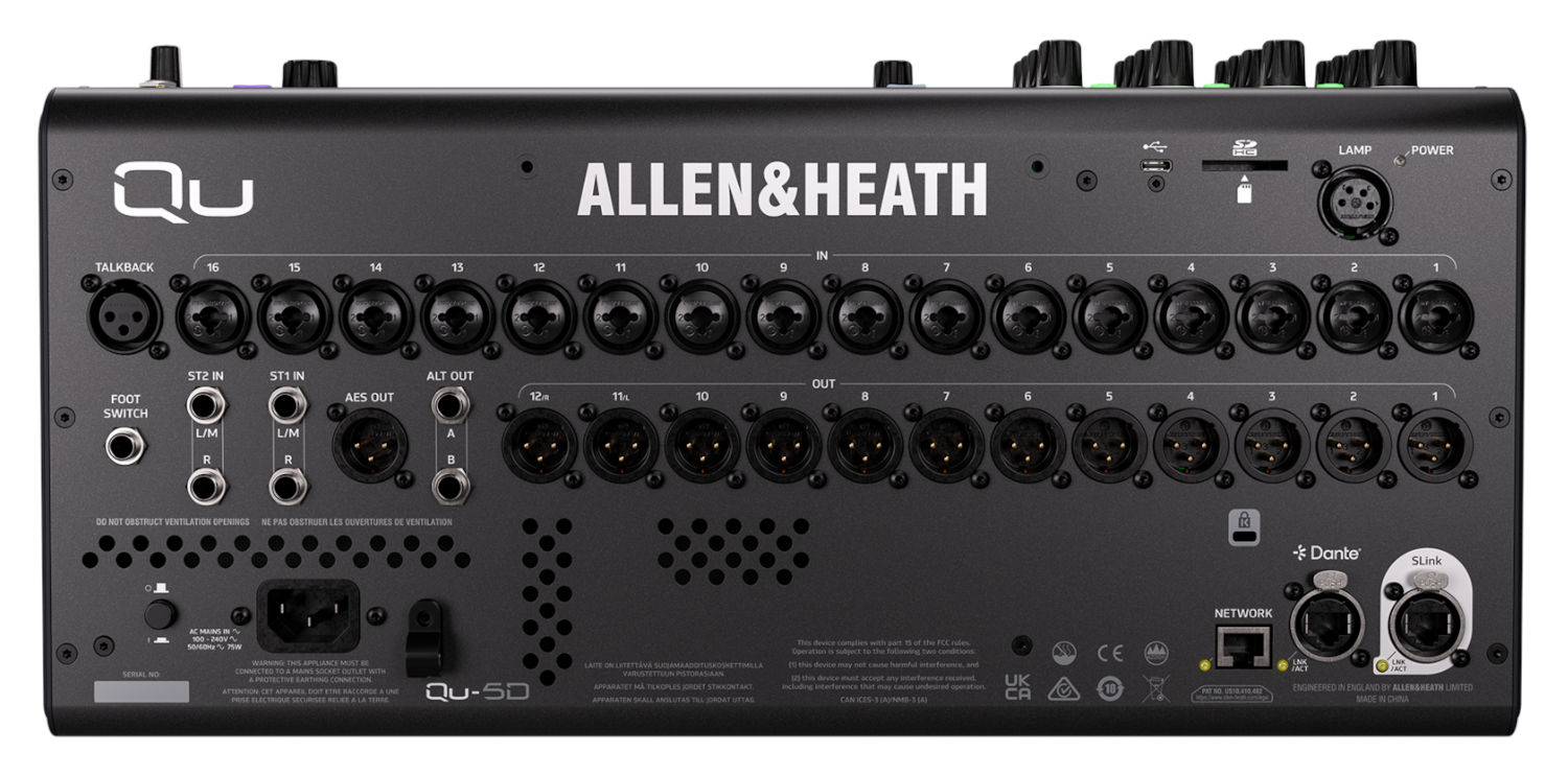 Dessutom har varianten Qu-5D en inbyggd 16x16 48/96 kHz Dante-port för kompatibilitet med annan Dante-aktiverad utrustning.