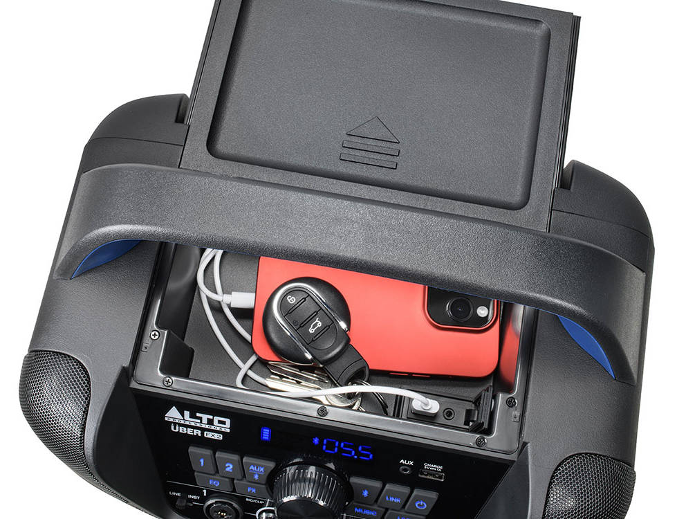 ALTO ÜBER FX2 är smidig att transportera tack vare dess inbyggda teleskophandtag och hjul. Förvara dina tillhörigheter och samtidigt ladda din mobila enhet i förvaringsboxen som finns på toppen av högtalaren. En praktisk flasköppnare hittar du på ena sidan och den inbyggda stämningsbelysningen på fronten smälter perfekt in i miljön när kvällen närmar sig.