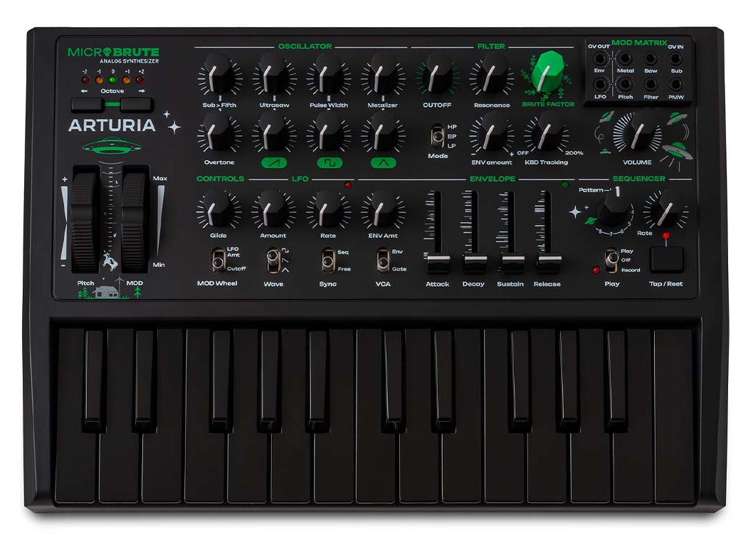 MicroBrute UFO is a tribute to the analog renaissance Arturia helped ignite. 100% analog signal path, a fat Steiner-Parker multimode filter, and the legendary Brute Factor™ drive deliver everything from searing leads to tectonic bass. As a unique edition, its matte space-black shell and martian-green accents make it as much statement piece as studio tool.