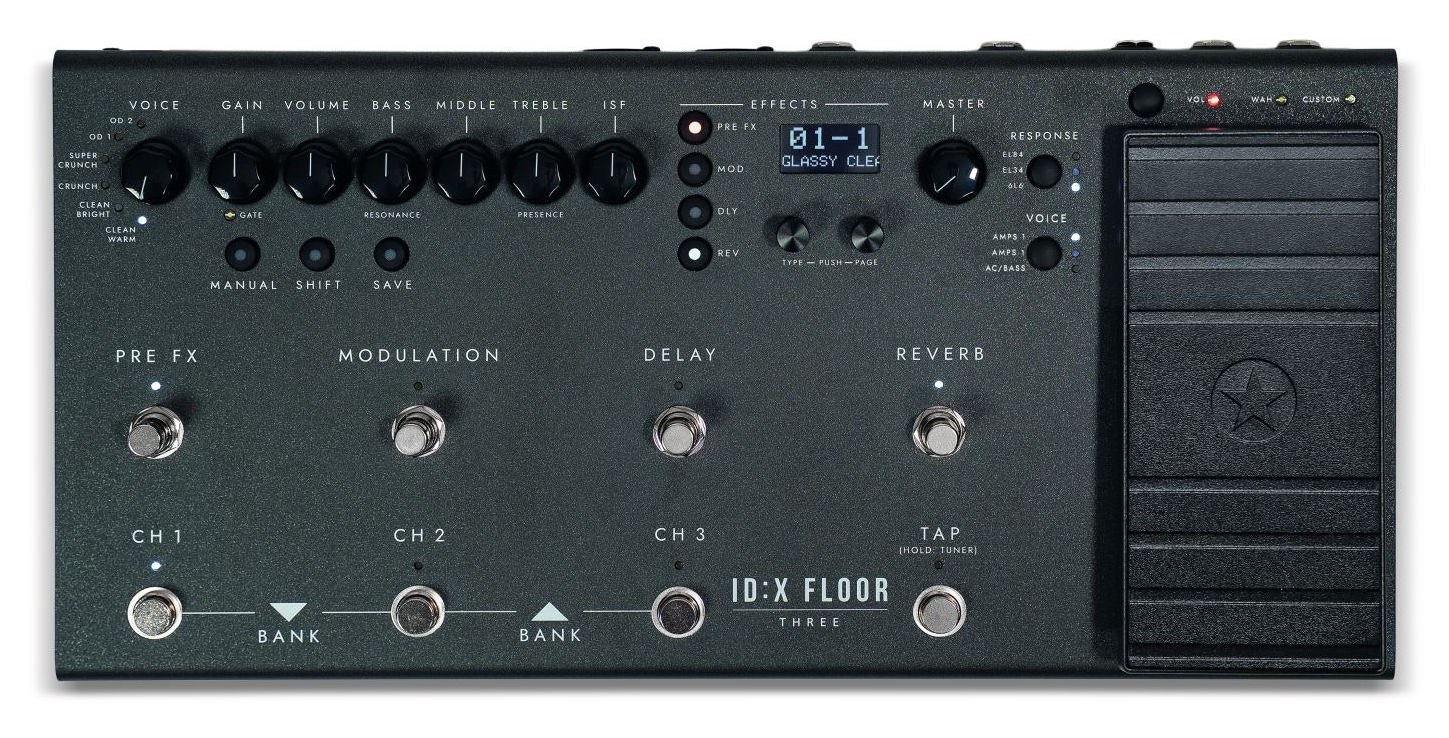 ID:X Floor Three erbjuder tolv autentiska modelleringar av klassiska förstärkare – sex originalmodeller från Blackstar och sex Ampton-rekreationer av ikoniska förstärkare – samt tre basförstärkare och två akustiska simulatorer. Valbar slutrörsrespons (EL84, EL34, 6L6) och Blackstars patenterade ISF-kontroll säkerställer att varje modell levererar en äkta känsla av en rörförstärkare. Den inbyggda pedalen ger realtidskontroll över wah, volym eller effektparametrar för uttrycksfullt spel, och den integrerade effektloopen öppnar för kreativa routingsmöjligheter med externa pedaler eller effektenheter.
