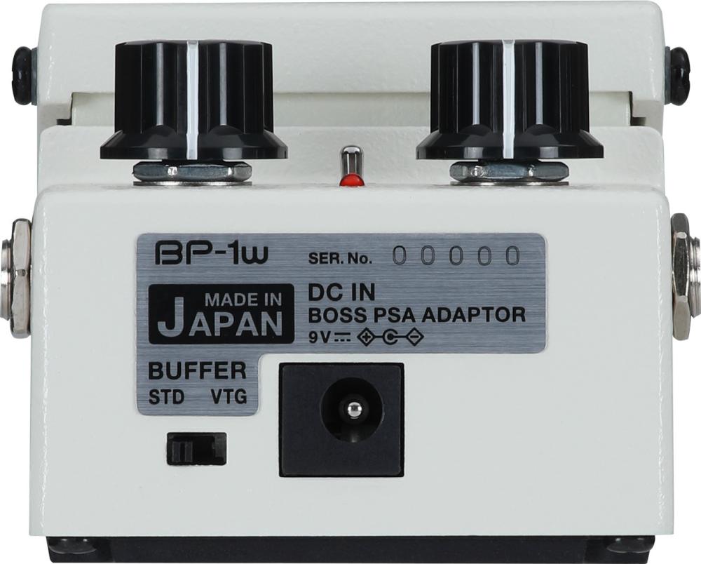 The BP-1W features high-quality buffer circuitry with two selectable types. Slide the rear panel switch to choose between the pure signal of a standard buffer or a vintage buffer with lower input impedance. The vintage type produces a warmer tone and a smooth dynamic response, with maximum benefits achieved by connecting a guitar with passive pickups directly to the BP-1W’s input. The standard buffer is always engaged for signal conditioning when the pedal is bypassed, regardless of the buffer switch setting.