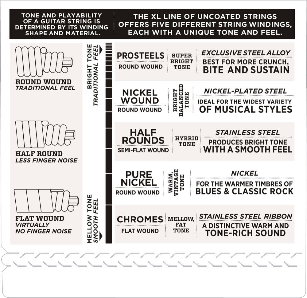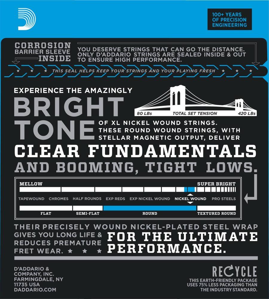 D'addarios mest populära elbassträngar. Nickelpläterat stål ger en stark magnetisk utgångssignal och en komfortabel jämn spelyta som reducerar för tidig utnötning av greppbrädesbanden. EXL-strängarna har ett distinkt och klart sound och en perfekt intonation.