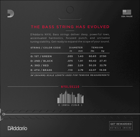 NYXL Bass kombinerar D'Addarios stålkolkärna, NY STEEL, med en omgjord nickelpläterad stålspinning. Denna konstruktion ger en djup och kraftfull baston med ett fokuserat, tajt och punchigt mellanregister och ett komplext övertonsregister. Designad för alla spelstilar har NYXL Bass ett större dynamiskt omfång och en längre sustain än någon annan bassträng.