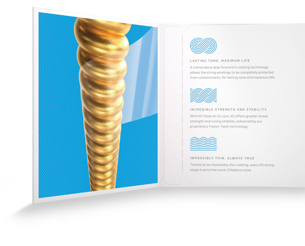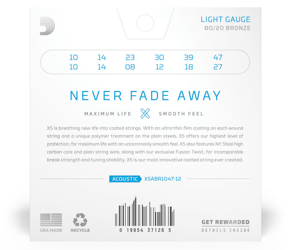 Varje enskild sträng i ett set XS är behandlad med D'Addarios skyddande mikrocoating, en supertunn ytbehandling som effektivt stöter bort smuts och svett. XS-strängarna varar 4ggr längre än traditionella o-coatade strängar utan att påverka den ton och spelkänsla som D'Addarios strängar blivit erkända för. D'Addarios unika stålkolkärna i kombination med en stark förankring av kulan, genom sk Fusion Twist technology, ger en sträng med oöverträffad styrka och som håller stämningen avsevärt bättre än vanliga strängar.