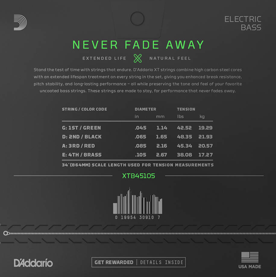 Varje enskild sträng i ett set XT är behandlad med D'Addarios skyddande mikrocoating, en supertunn ytbehandling som effektivt stöter bort smuts och svett. XT-strängarna varar 4ggr längre än traditionella o-coatade strängar utan att påverka den ton och spelkänsla som D'Addarios strängar blivit erkända för. D'Addarios unika stålkolkärna i kombination med en stark förankring av kulan, genom sk Fusion Twist technology, ger en sträng med oöverträffad styrka och som håller stämningen avsevärt bättre än vanliga strängar.