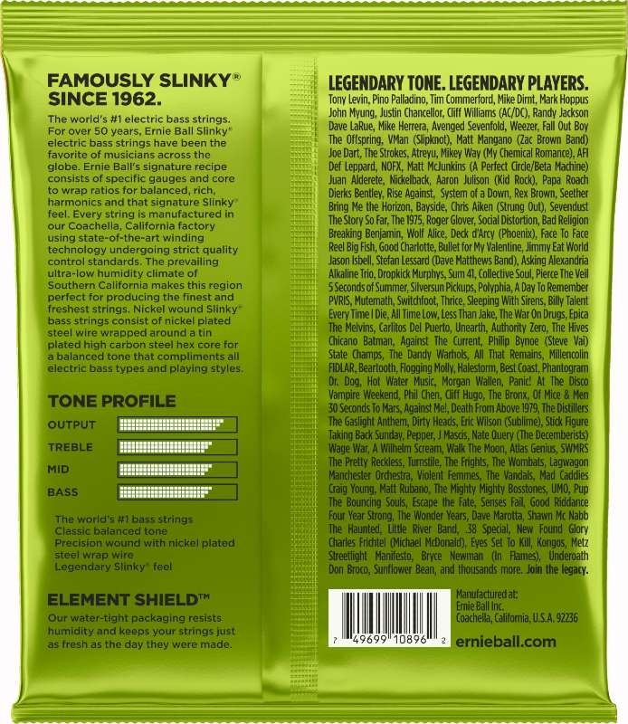 Liksom alla andra Ernie Ball-strängar är Slinky Nickel Wound Bass tillverkade i Coachella Valley i Kalifornien, USA. Dessa strängar har en lindning av nickelplätterat stål som lindas runt en 6-kantig (hex-shaped) kärna. Resultatet? Jo det blir en sträng som har en artikulerad ton och är över hela registret. Oavsett om du har en 5-eller 6-strängad bas, om du vill stämma ner eller spela slap så har Slinky Nickel Wound ett set som passar dig och din bas.