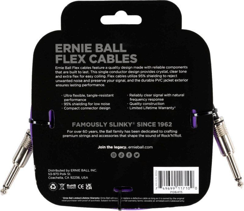 Ernie Ball Flex-instrumentkablar är designade med ton och pålitlighet i fokus. Resultatet är en kabel med en ren och ofärgad ton med extra "flex" som gör att kabeln är lätthanterlig utan att trassla sig. Flex-kablarna har en väl tilltagen skärmning för att reducera oönskade störningar och bibehålla tonen i ditt instrument. Kablarna har dessutom en extra skydd vid kontakterna för att ytterligare öka livslängden på kablarna.