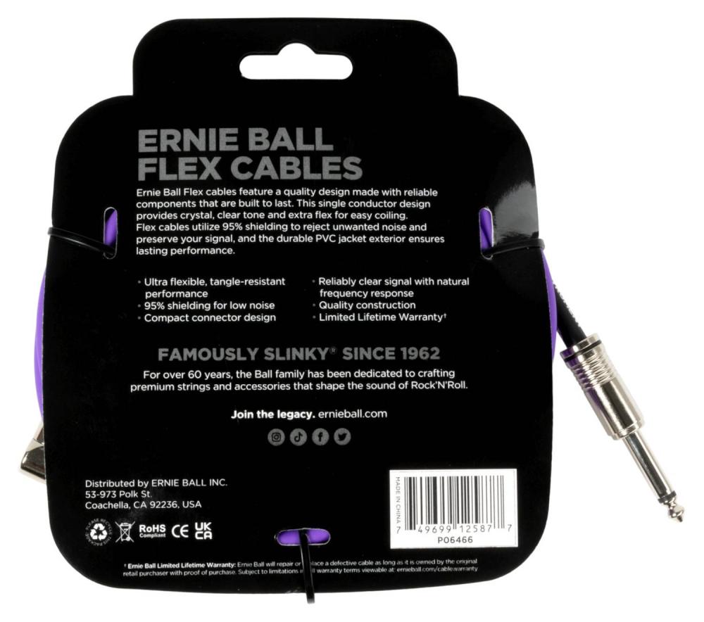 Ernie Ball Flex-instrumentkablar är designade med ton och pålitlighet i fokus. Resultatet är en kabel med en ren och ofärgad ton med extra "flex" som gör att kabeln är lätthanterlig utan att trassla sig. Flex-kablarna har en väl tilltagen skärmning för att reducera oönskade störningar och bibehålla tonen i ditt instrument. Kablarna har dessutom en extra skydd vid kontakterna för att ytterligare öka livslängden på kablarna.