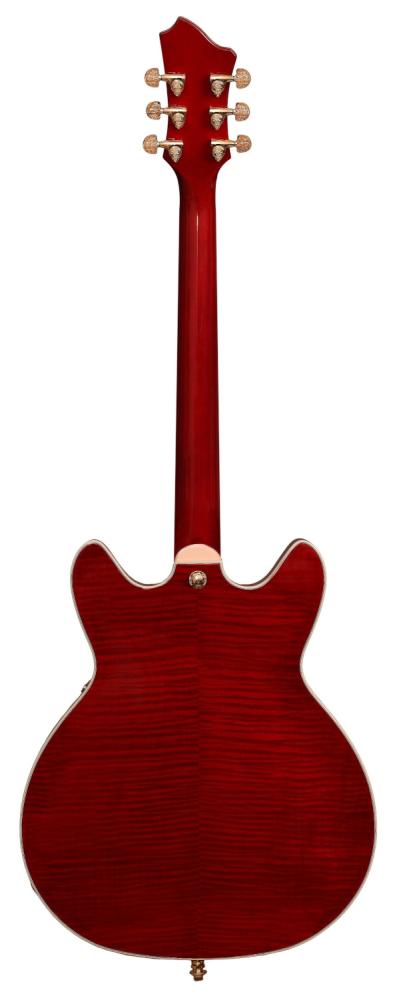 Denna extraordinära Viking är en kombination av klassiskt hantverk och moderna förbättringar. Handplockad kanadensisk flammig lönn utgör den halvakustiska kroppen och ger den värme och resonans som Viking är känd för. Hagströms Resinator greppbräda, uppskattad för sin stabilitet och balanserade tonrespons, är nu utsmyckad med en exklusiv Ragnarök inlay i greppbrädan som symboliserar både tradition och förnyelse.