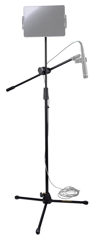 Eftersom bommen sitter i en egen, justerbar klamp på mikrofonstativet så har detta stativ en fästgänga även i toppen, vilket gör att du kan fästa ex. en hållare för surfplatta där & så ha mikrofonen på bommen. Så detta är ett stativ med möjlighet att fästa två grejer i.