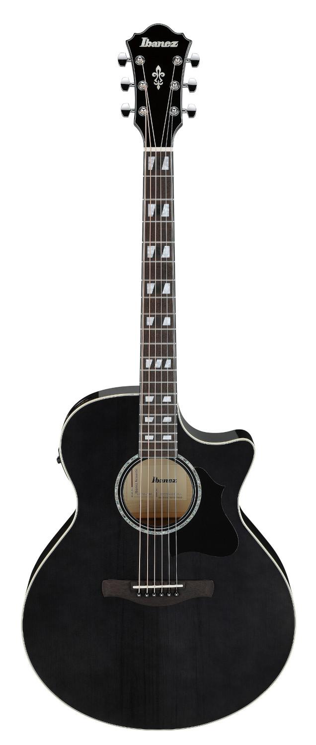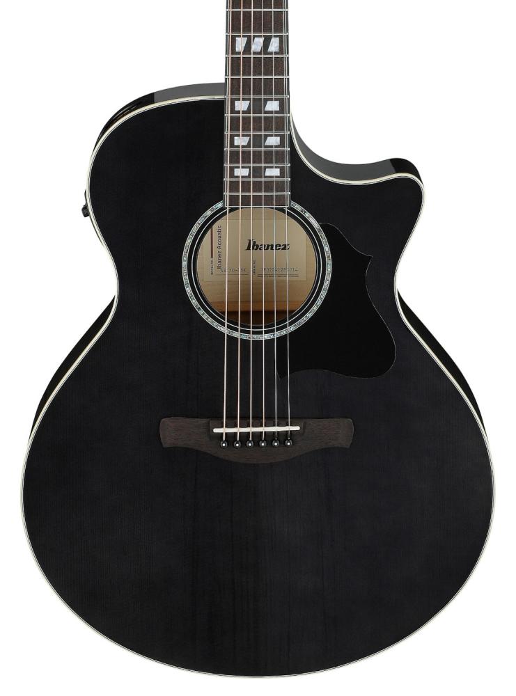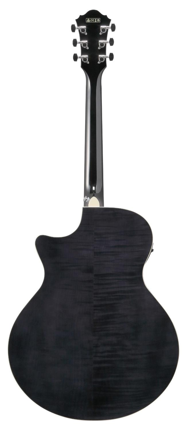AE170 har ett lock av solid Sitka gran med kropp och sidor av flammig lönn, lackerad i transparent svart.