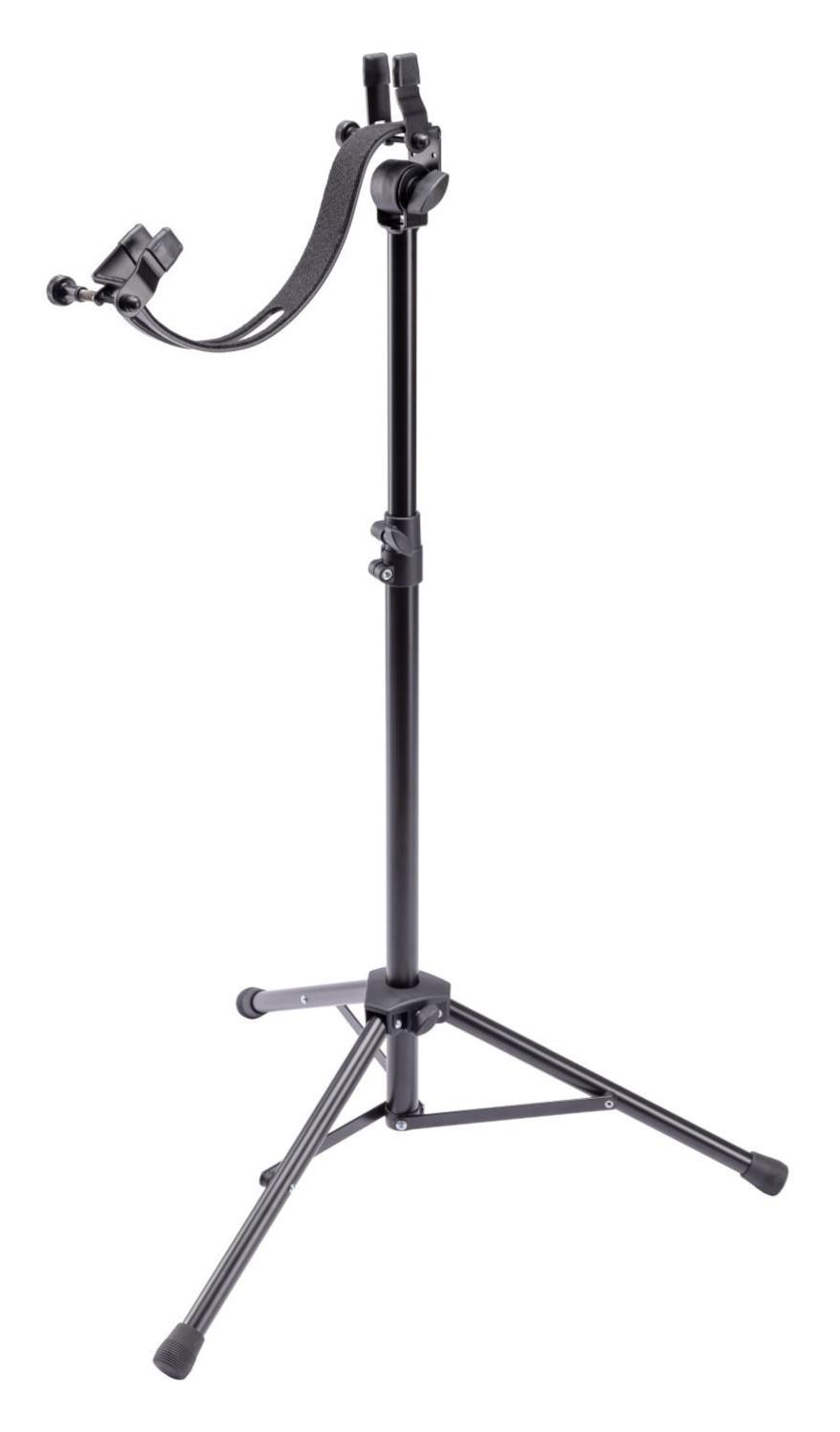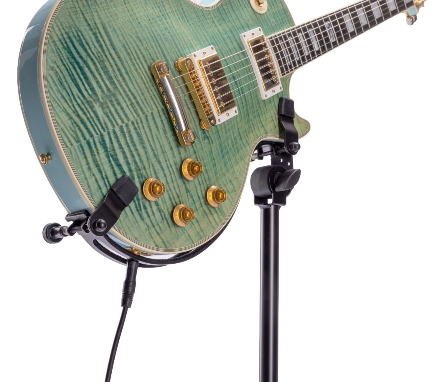 Stativet har en slitsad stödplatta som gör det möjligt att leda kablar för instrument med sidomonterad jackkontakt, såsom Gibson Les Paul och andra liknande modeller. De justerbara klämmorna passar gitarrkroppsbreddar mellan 39 och 60 mm. Konstruktionen i stål med rörben och tvärstag ger stabilitet, och det tvådelade fällbara stativet gör transport och förvaring enkel.
