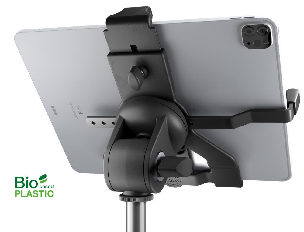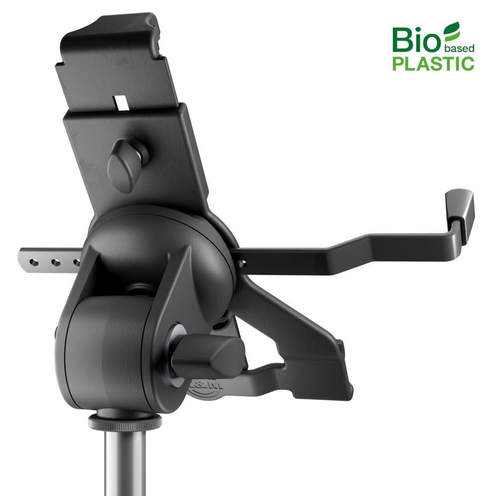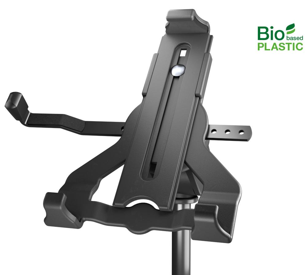Universal tablet holder with a practical clamping mechanism for all tablets with an approx. size of 10" to 16". The tablet mount is made of bio-based plastic. These plastics contain a proportion of over 50% up to 100% of renewable plant-based raw materials. The use of renewable raw materials helps to conserve limited petroleum resources and reduce harmful CO2 emissions. More info on bio-based plastics at: bioplastic.k-m.de. The clamping range of the tablet stand holder is between 158 and 280 mm. The holder is also particularly suited for tablets with a protective cover or case up to 20 mm thickness. The overlapping clamping jaws with integrated rubber pads provide for a secure hold and eliminate unwanted vibration noises. The function of the operating elements on the device is not impaired. An adjustable mounting bracket with felt padding provides additional safety when the tablet holder is positioned vertically and prevents the tablet PC from falling out even under heavy use. The holder can be swivelled and tilted, allowing each user to position it individually. The swivel movement can be adjusted from easy to tough via a clamping screw. The tablet holder can be rotated between portrait and landscape format without further ado, whereby independent turning is prevented. Whether on stage, in the rehearsal room or at home - thanks to the 3/8" or 5/8" internal thread, the holder can be easily screwed onto any microphone stand or similar.