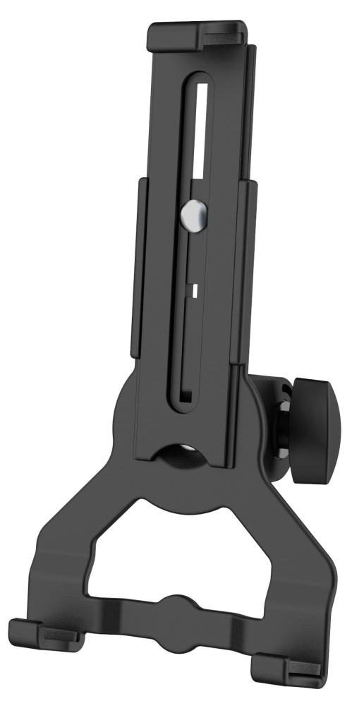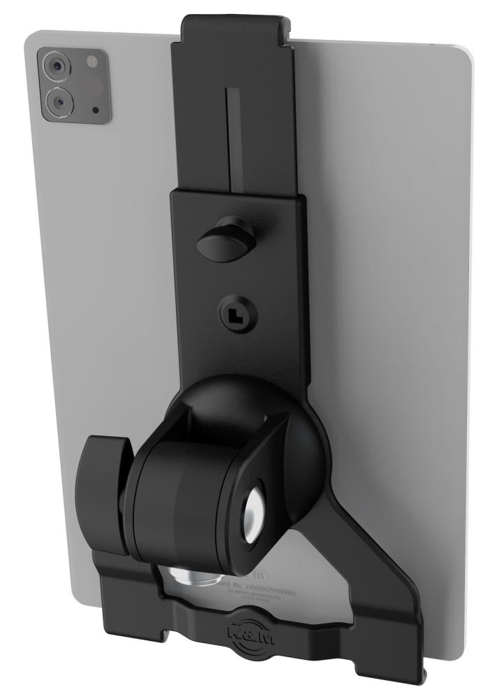 Universal tablet holder with a convenient clamping mechanism for tablets ranging in size from approx. 10" to 16" in horizontal - and approx. 7" to 13" in vertical position. The clamping range of the tablet PC holder is between 155 and 307 mm The tablet holder is made of bio-based plastic. These plastics contain a proportion of over 50% up to 100% of renewable vegetable raw materials. The use of renewable raw materials helps to conserve limited petroleum resources and reduce harmful CO2 emissions. More information on bio-based plastics at: bioplastic.k-m.de. The holder is also particularly suitable for tablets with a protective cover or case up to 20 mm thick. The overlapping clamping jaws with integrated rubber pad guarantee a secure hold and eliminate unwanted vibration noise. The function of the operating elements on the device is not impaired. The holder can be tilted, allowing each user to position it individually. Whether on stage, in the rehearsal room or at home - thanks to the 3/8" or 5/8" internal thread, the holder can be quickly and easily screwed onto any microphone stand.