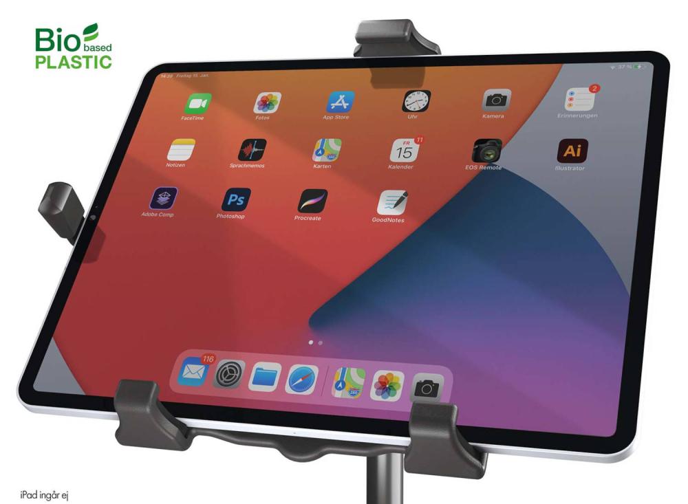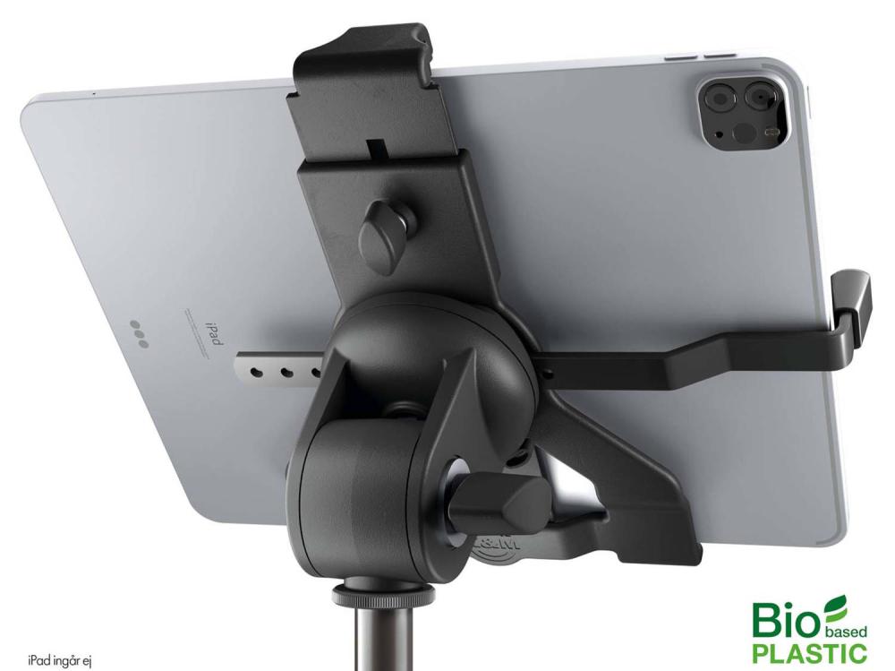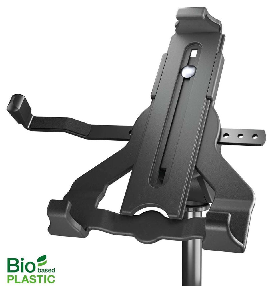 Stativ med justerbar hållare för surfplattor. Passar tablet som är 158 - 280mm x 150 - 430mm och en tjocklek på max 18mm. Stativet är tredelat vilket ger en högre skillnad mellan högsta och lägsta läge. Hållaren är tillverkad av biobaserad plast. Robust modell som är tillverkad av stryktålig plast och stål.