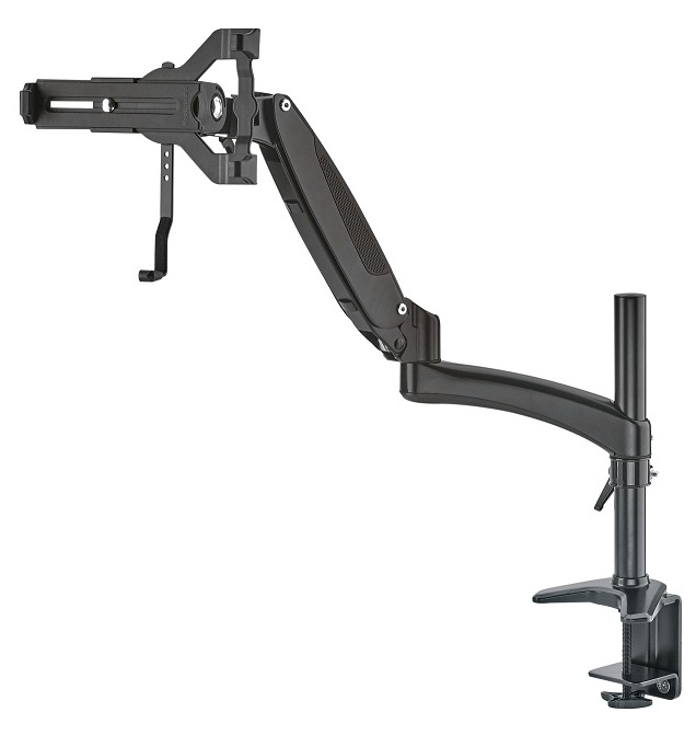 The comfortable solution for your workplace or home studio. With this table mount you can position a tablet with a size of 10" to approx. 16" in a space-saving and ergonomic way. The robust aluminum construction with the integrated pneumatic spring can bear a load of up to 8 kg. The tablet mount is made of bio-based plastic. These plastics contain a proportion of over 50% up to 100% of renewable plant-based raw materials. The use of renewable raw materials helps to conserve limited petroleum resources and reduce harmful CO2 emissions. More info on bio-based plastics at: bioplastic.k-m.de. The clamping range of the tablet stand holder is between 158 and 280 mm. The holder is also particularly suited for tablets with a protective cover or case up to 20 mm thickness. The overlapping clamping jaws with integrated rubber pads provide for a secure hold and eliminate unwanted vibration noises. The function of the operating elements on the device is not impaired. An adjustable mounting bracket with felt padding provides additional safety when the tablet holder is positioned vertically and prevents the tablet PC from falling out even under heavy use. The holder can be swiveled and tilted, allowing each user to position it individually. The swivel movement can be adjusted from easy to tough via a clamping screw. The tablet holder can be rotated between portrait and landscape format without further ado, whereby independent turning is prevented. For a neck-friendly posture and a perfect viewing angle, the tablet holder can be continuously tilted, rotated and swiveled. Thanks to the large stable table clamp (up to 85 mm thick), the complete holder is quickly mounted and can be used as desired. Here, a height adjustment of up to 200 mm is possible. The upper arm offers an additional 350 mm of height adjustability. The integrated cable management also ensures a tidy and professional impression.
