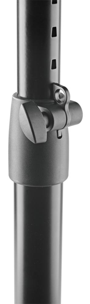 Height-adjustable monitor stand with table clamp for near-field monitors. The solid metal construction with the large support plate (205 x 245 mm) is suitable for a wide range of monitors and other equipment in the same size range. A practical table clamp allows it to be attached to tabletops with a thickness of 10 to 52 mm. The individual height adjustment is possible in 6 steps between 335 and 485 mm. In terms of load capacity, a centric load of up to 25 kg is possible. The support plate can be rotated 360° for perfect alignment. Rubber pads are included for secure, noise-insulating support of the monitors.
