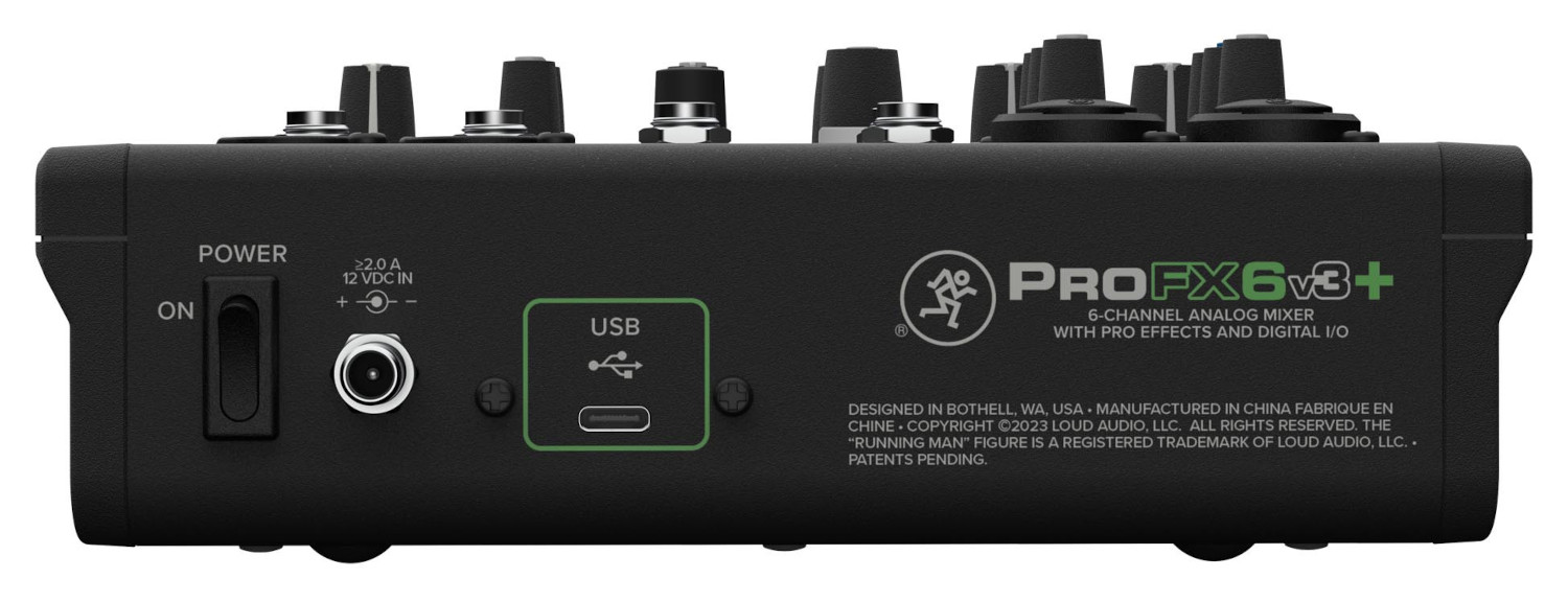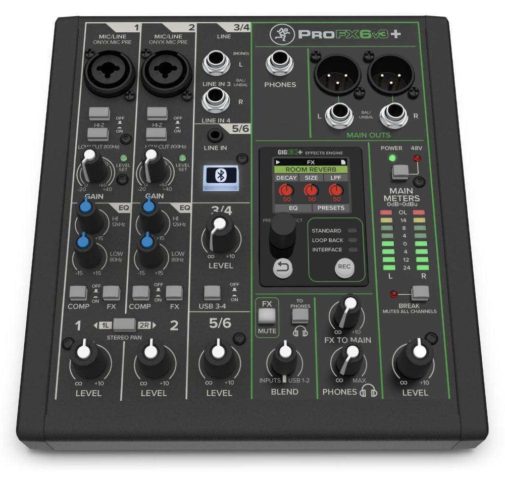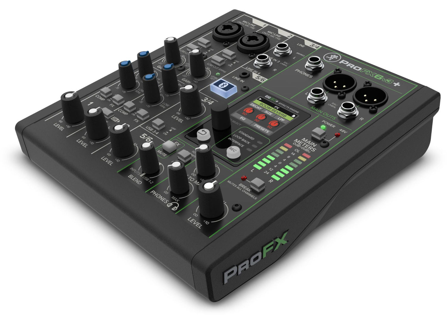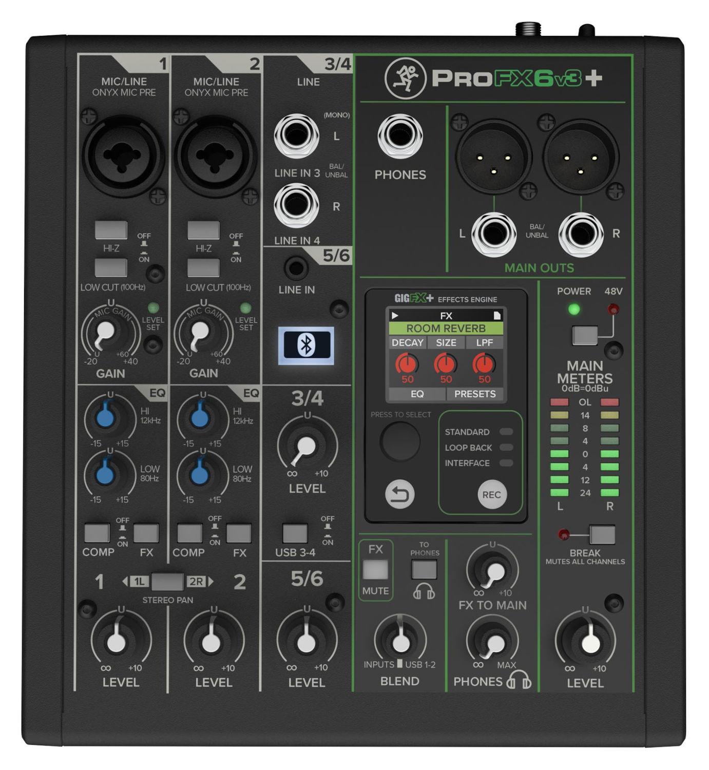 Mackie ProFX6v3+ is a professional analog mixer and USB-C audio interface with powerful enhancements for studio-quality recordings and live streams. Capture your performance with Onyx preamps and channel EQ, add computer audio via loopback, bring in calls via Bluetooth® and enhance your sound with upgraded GigFX+ effects on a color LCD screen.