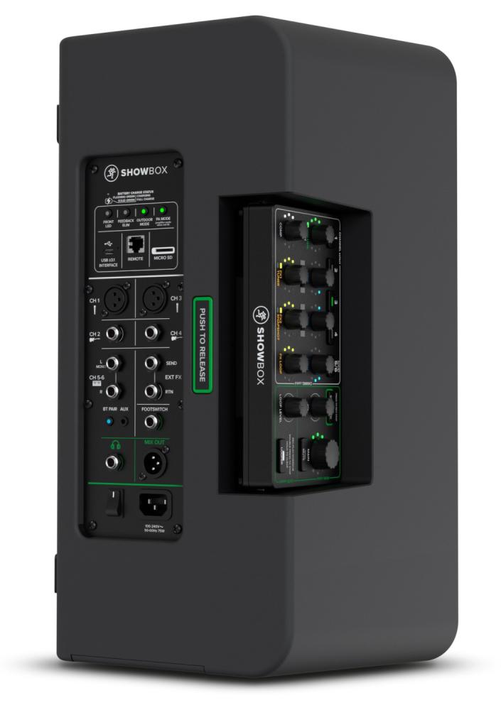 Mackie ShowBox is a battery-powered live performance rig that makes it easy to get great live sound anywhere. It’s a portable PA, acoustic guitar amp, 6-channel mixer, effects rack and USB-C interface, all in a single device.