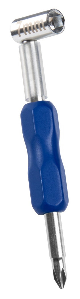Verktyg med truss rod-nyckel i ena ändan och en magnetisk stjärnmejsel i andra.