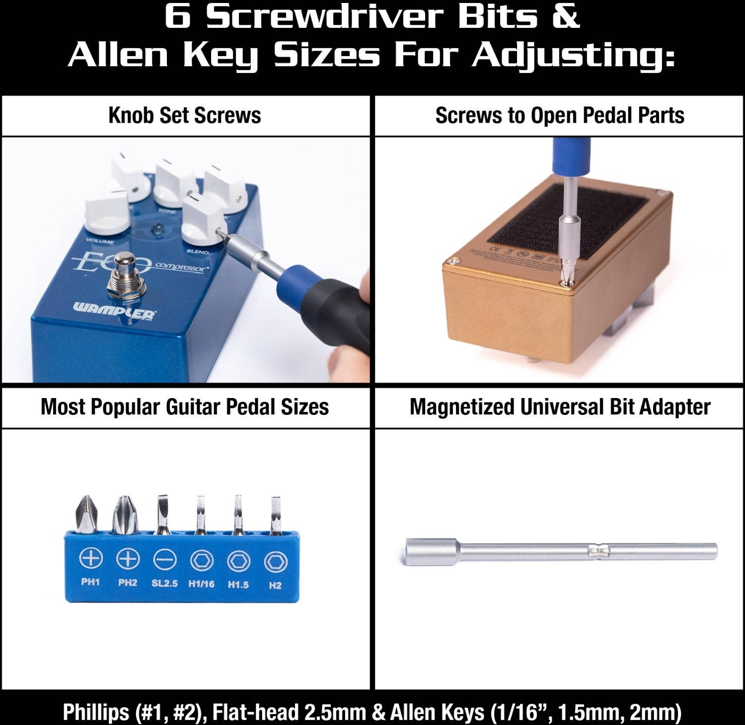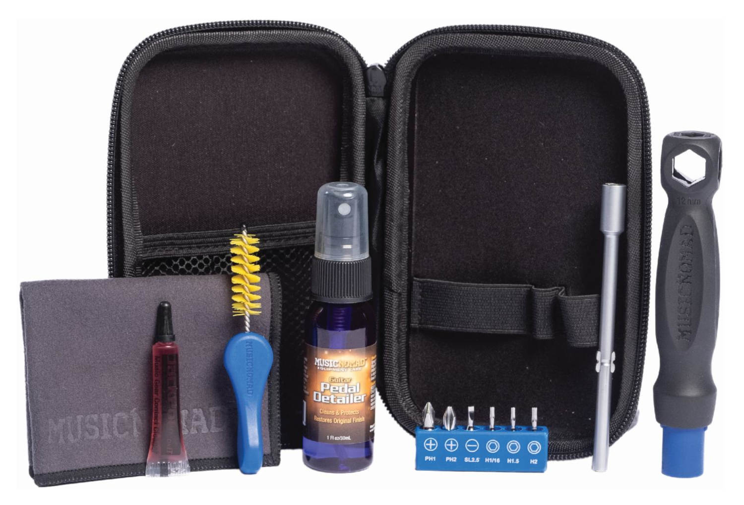 Effektpedaler lever ett hårt liv. Med MusicNomads Guitar Pedal Care kit hittar du det man behöver för att hålla pedalerna i gott skick. I kitet ingår ett verktyg som fungerar som handtag till bitshållaren men som också kan användas för att dra åt muttrar i storlekarna 8mm, 10mm, 11mm, 12mm, 14mm, 15mm, 1/2”. Den medföljande bits-satsen innehåller sex olika bits, 2 x stjärn-bits, 1 x flat-bits och 3 x insex-bits.