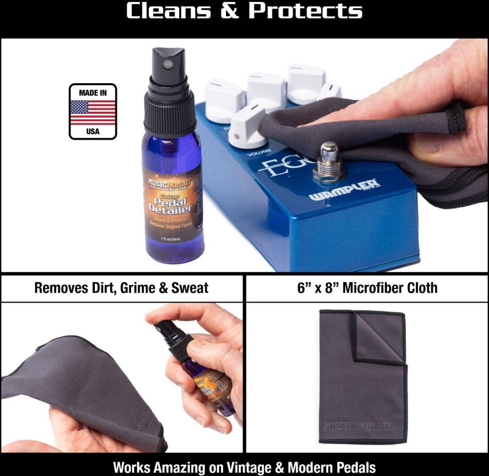 Guitar Pedal Detailer är medlet du använder för att ta bort smuts, svett och annat som kan ha fastnat på pedalen och det fungerar på plast, metall och även gummi. För att göra ren och putsa pedalen så används mikroduken som är luddfri.