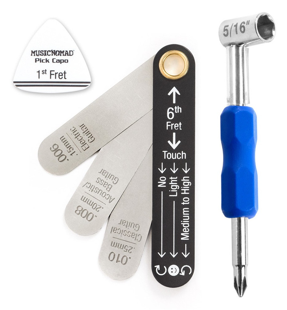 För att enkelt justera halsen på din Gibson och Amerikanskbyggda PRS-gitarr så har MusicNomad tagit fram ett set med dragstångsnyckel och måttsats. Måttsatsen kommer med de vanligaste relief-måtten för elektriska, akustiska gitarr samt även för elbasar, för just Gibson och PRS rekommenderas generellt måttet .006". Dragstångsnyckeln är konstruerad att passa PRS och Gibson eller andra instrument där dragstångshuvudet är 5/16" och där halsen justeras vid huvudet. I andra änden av dragstångsnyckeln hittar man en praktisk magnetisk stjärnskruvmejsel, perfekt när man tar bort dragstångsluckan.