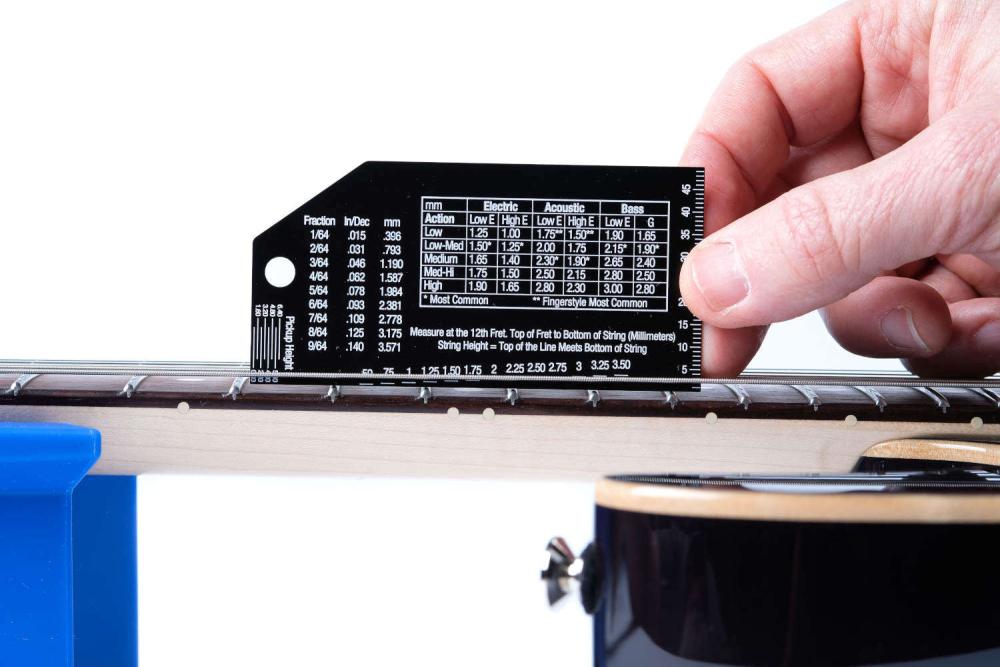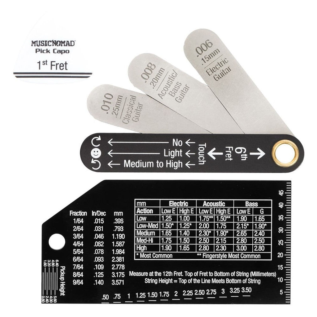 Två av de mest populära mätverktygen i ett pack. Om halsen är rak, konkav eller konvex längs med greppbrädan är väldigt viktig för att instrumentet skall vara enkelt att spela på samtidigt som man kan undvika bandrassel om detta är korrekt inställt. Detta tillsammans med stränghöjden gör med andra ord, spelbarheten. I MusicNomads MN614 finns specifika mätverktyg för just stränghöjden och halsens rakhet. Det finns tre olika mått , .006”, .008”, .010” för halsjusteringen beroende på instrument, på handtaget finns dessutom instruktioner för att göra handhavandet enkelt. Även mätverktyget för stränghöjden har tryckta instruktioner för att hjälpa dig hitta rätt stränghöjd för ditt instrument. Båda verktygen fungerar lika bra för elektriska och akustiska gitarrer som elektriska och akustiska basar.
