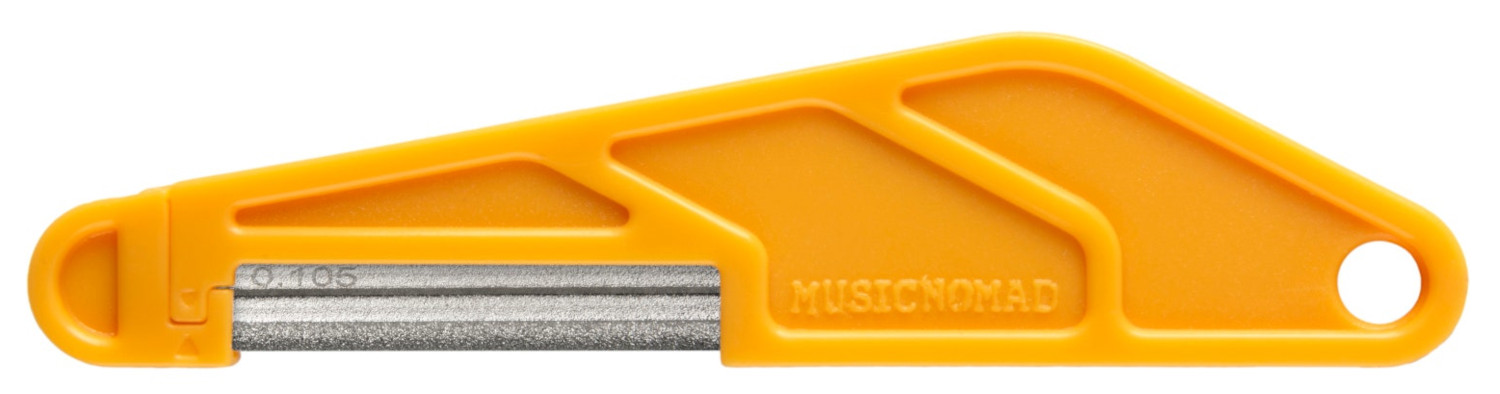 MusicNomad's Diamond Coated Nut File fungerar lika bra på sadlar i ben, grafit, plast eller TUSQ som i metall. Den unika utformningen gör att filbladet inte böjer sig vid användning vilket ger ett exakt och perfekt resultat. Beläggningen både filar och polerar på samma gång så ingen efterputsning behövs för att få en perfekt yta för strängen att vila mot. För att du tydligt ska ha koll på dina filar är storleken lasergraverad på filbladet och det ergonomiska handtaget i plast har ett hål för upphängning så du kan ha tydlig ordning och reda på dina verktyg. Med en längd på 120mm är den lagom stor för att vara lättgreppad men ändå smidig nog för att inte ta för stor plats på din arbetsbänk.