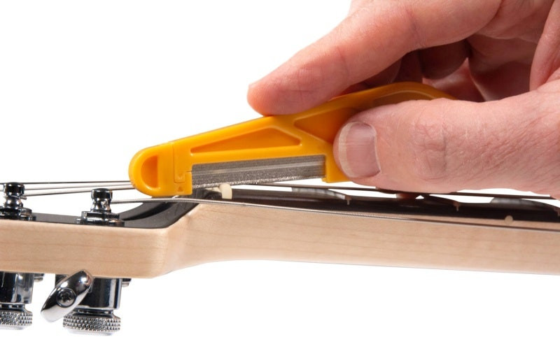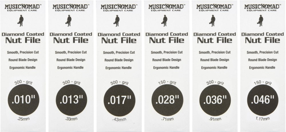 MusicNomad's Diamond Coated Nut File fungerar lika bra på sadlar i ben, grafit, plast eller TUSQ som i metall. Den unika utformningen gör att filbladet inte böjer sig vid användning vilket ger ett exakt och perfekt resultat. Beläggningen både filar och polerar på samma gång så ingen efterputsning behövs för att få en perfekt yta för strängen att vila mot. För att du tydligt ska ha koll på dina filar är storleken lasergraverad på filbladet och det ergonomiska handtaget i plast har ett hål för upphängning så du kan ha tydlig ordning och reda på dina verktyg. Med en längd på 120mm är den lagom stor för att vara lättgreppad men ändå smidig nog för att inte ta för stor plats på din arbetsbänk.
