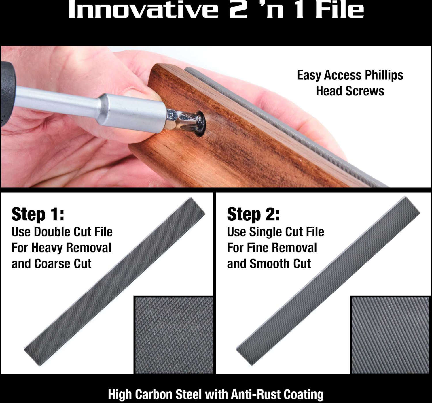 Filen som ingår är tillverkad i kolstål och har två sidor som är olika grova allt utifrån behov och verkar på alla typer av band, nickel silver, EVO Gold och rostfritt stål. Skårorna i handtaget som håller filen är extra djupa för att se till att inte filen skadar kroppen när man filar banden närmast kroppen.