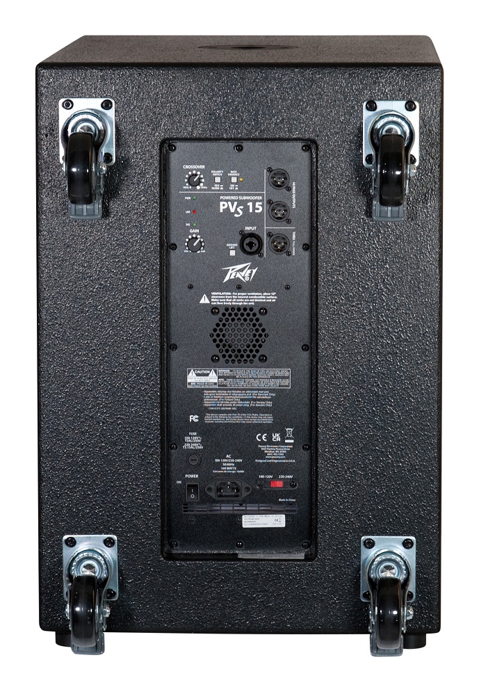 The Peavey PVs 15 Sub is a compact vented powered subwoofer system utilizing a 15" heavy-duty woofer, coupled to a DSP controlled power amplifier with 1,000 watts peak available power. The full-length black perforated steel grille provides protection and a professional appearance, along with the sturdy steel handles for moving the sub. Large heavy-duty locking casters on the rear provide for easy transport on suitable surfaces.