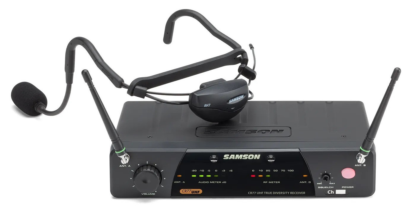 The Samson AirLine 77 AH7 Fitness Headset system is a wireless microphone solution designed to meet the specific demands of fitness instructors and active performers. With the unique AH7 micro transmitter mounted to a sweat-resistant Qe fitness headset microphone, you can free yourself completely from cables and beltpacks for a truly exhilarating and motivating experience. This allows you to focus on your class or performance, and not have to worry about your audio.