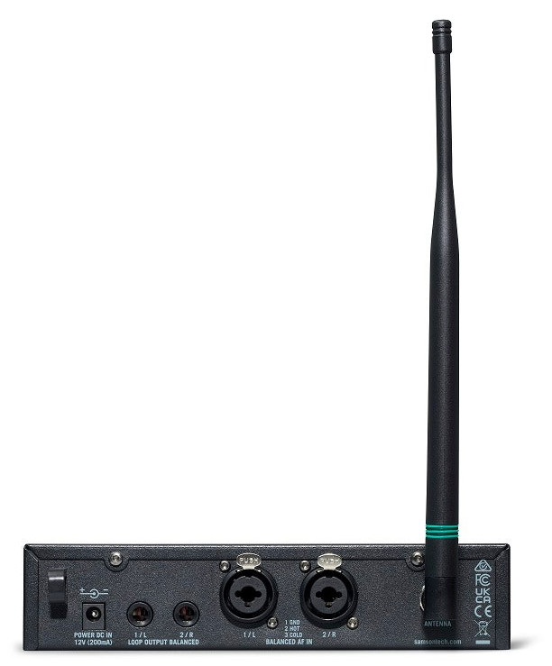 - Halv rackbredd-sändare med rackmonteringssats, XLR/6,35 mm-ingångar och 6,35 mm loop-utgångar
