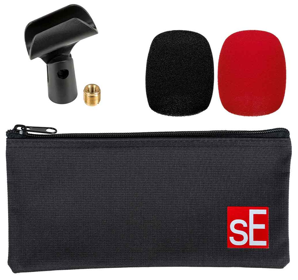 Levereras med väska, mikrofonklyka, gängadapter och ett svart och ett rött puffskydd .