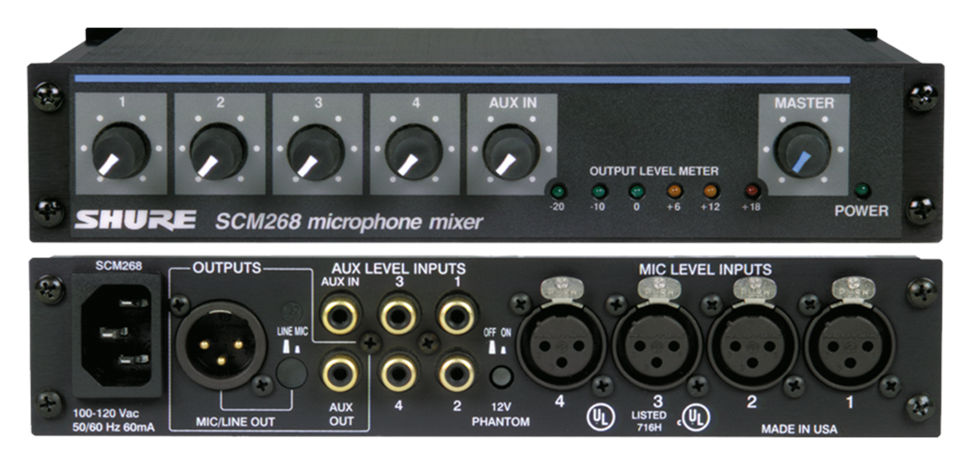 Den konkurrenskraftiga SCM268-mikrofonmixern har sex transformatorer inuti: fyra transformatorbalanserade XLR-mikrofonnivåingångar, en transformatorbalanserad XLR-mikrofon/linjeutgång och en intern ringformad krafttransformator med lågt elektromagnetiskt störningsfält.