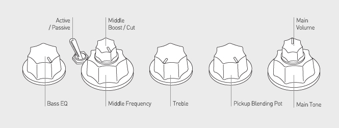 - Controls : Volume / Tone (dual pot), Pickup blender, Treble, Middle / Middle frequency (dual pot), Bass, Mini toggle (active / passive)