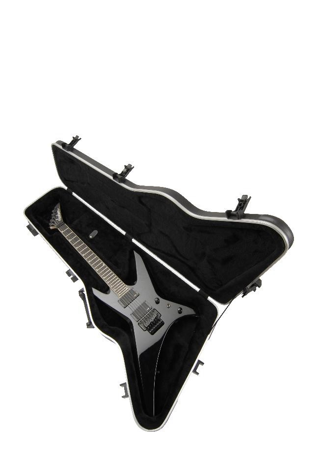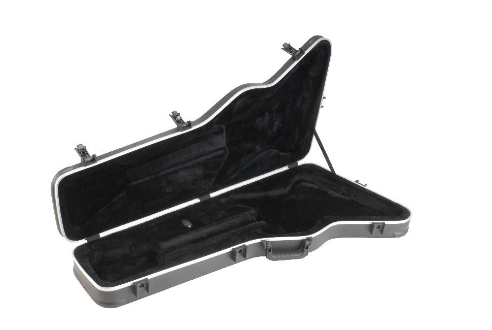 A distinctively shaped case designed to fit "pointy style" guitars such as, Firebirds (including models with "banjo" style tuners), Explorer®, Jackson Kelly, Jackson Warrior models, and more. This unique case features a plush black lining over a molded EPS foam interior to cradle the guitar and provide neck support with a convenient accessory compartment. The exterior is constructed of a nearly indestructible molded ABS polymer that has been engineered to provide the ultimate protection during transport with TSA recognized and accepted SKB trigger release latching system which allows the user to lock the case and still have it inspected by airline security personnel.Additional features include a nearly indestructible injection molded rubber over-molded cushioned carrying handle with injection molded feet and a bumper protected valance. Gibson Trademarks are owned by Gibson Guitar Corp. and SKB is in no way affiliated with Gibson Guitar Corp.