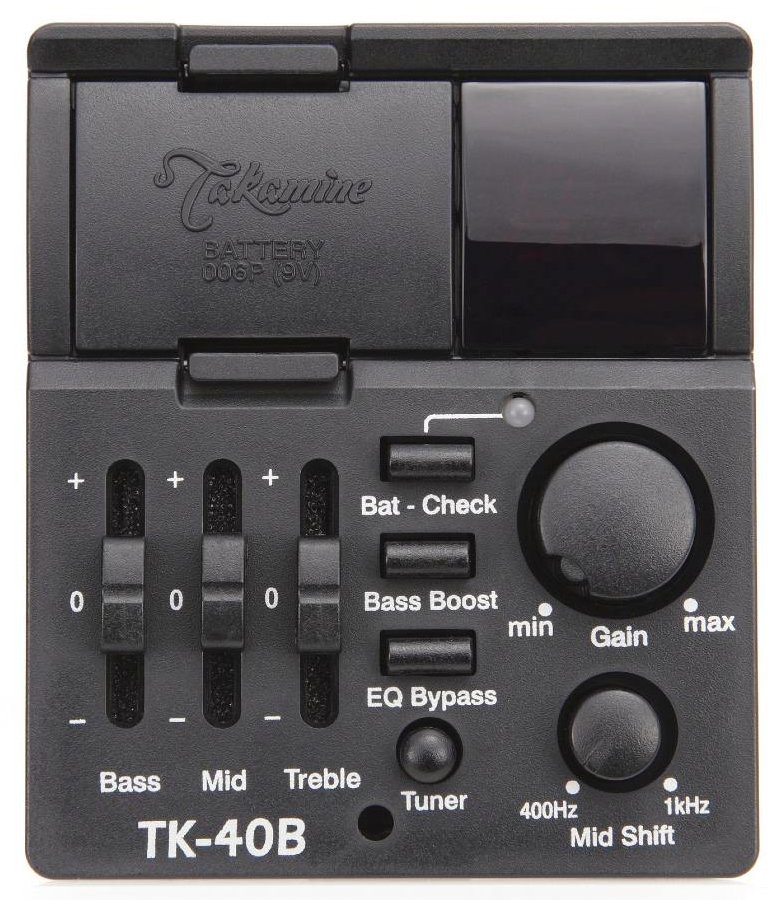 Takamine TK-40B preamp-system med bland annat 3-bands EQ, gain-kontroller, bass-boost switch, EQ bypass switch & inbyggd kromatisk stämapparat gör giget smidigt värre.