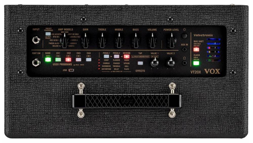 Med 11 förstärkarmodeller (20 via editor), 12 effekter, 33 presets och full USB-anslutning erbjuder VT20X en flexibel ljudplattform för hemmet, replokalen och inspelning. Den täta bass-reflex-kabinetten ger fylligare bas, och VOX Tone Room-mjukvaran gör det möjligt att förfina varje detalj i ljudet.
