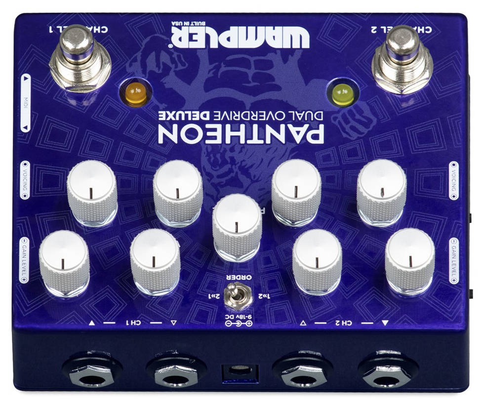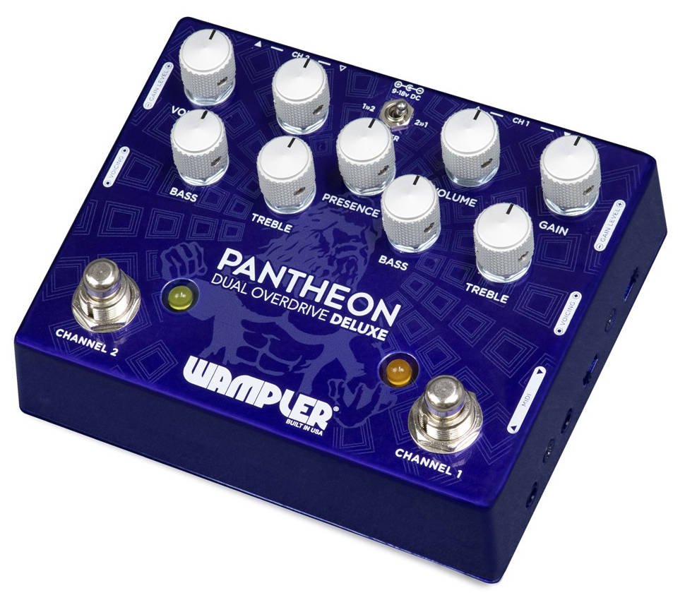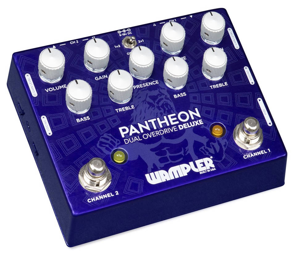 Pantheon Deluxe är en dubbelpedal med 2 närbesläktade kretsar. Båda baseras på en Blues Breaker men den ena har en mer modern ton. Dessutom har du 3 olika voicings och 3 olika Gainsteg per sida. Det går också att styra denna pedal via MIDI.