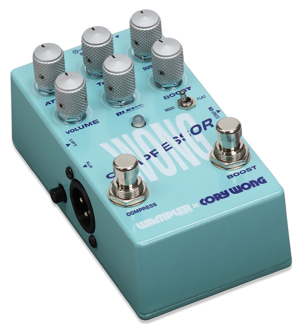 The Wampler EGO compressor has been an integral part of Cory Wong’s signature sound for years, providing the light touch required to subtly drive the best from his tone, so this was a natural starting point for designing his signature pedal. Cory’s vision included some very specific features including an XLR out so he could go straight into a computer interface, mixing desk, or PA for those signature bright and clean tones. He also wanted to add a boost that allowed him to choose either a flat volume boost or a rich, saturated boost that could push his midrange a little, all in a compact pedal enclosure with two foot-switches and an always-ON mode allowing stage friendly operation. The Wampler Cory Wong Compressor delivers all of this with the premium build quality Wampler is known for. The Wampler Cory Wong compressor features two soft footswitches that operate each function of the pedal with a three-color LED indicator to show which mode is active. The Compressor side offers complete control over Volume, Sustain, Attack, and Blend as well as Brian Wampler’s signature Tone control which can be dialed in to add sparkle and chime to your guitar’s tone. On the boost side, a single rotary boost control adjusts the amount of boost activated and a profile switch sets the mode of the boost circuit from a flat boost to a rich saturated boost with an extra vibrancy around the 550Hz range. Combine both channels for glorious compression and a powerful lead boost. The Cory Wong Compressor is a complete solution for sculpting tone either on the stage or in the studio