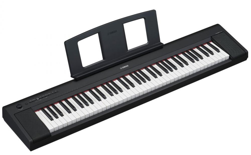 A 76-key keyboard (a conventional piano has 88 keys) that allows you to perform piano pieces with greater authenticity, without requiring much space. Although the keys have the same box shape as those on a piano, the keyboard has a lighter feel that makes it easy for beginning pianists to start, rather than the weightier feel of a standard piano keyboard. You can also use headphones with the NP-35 if you are worried about disturbing those around you with your playing.
